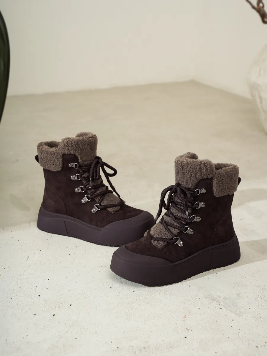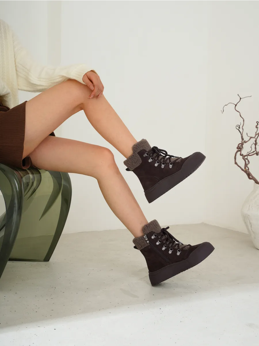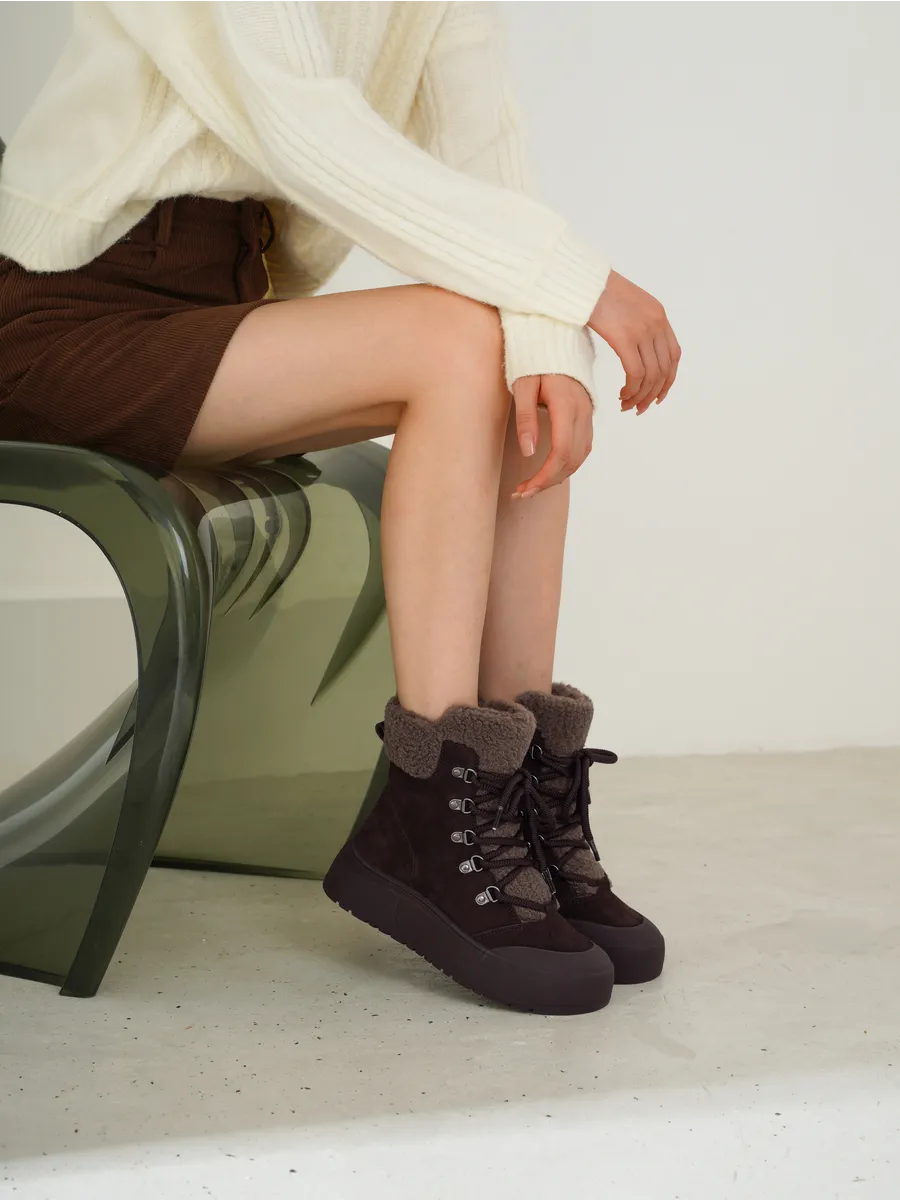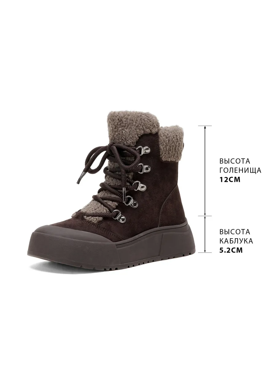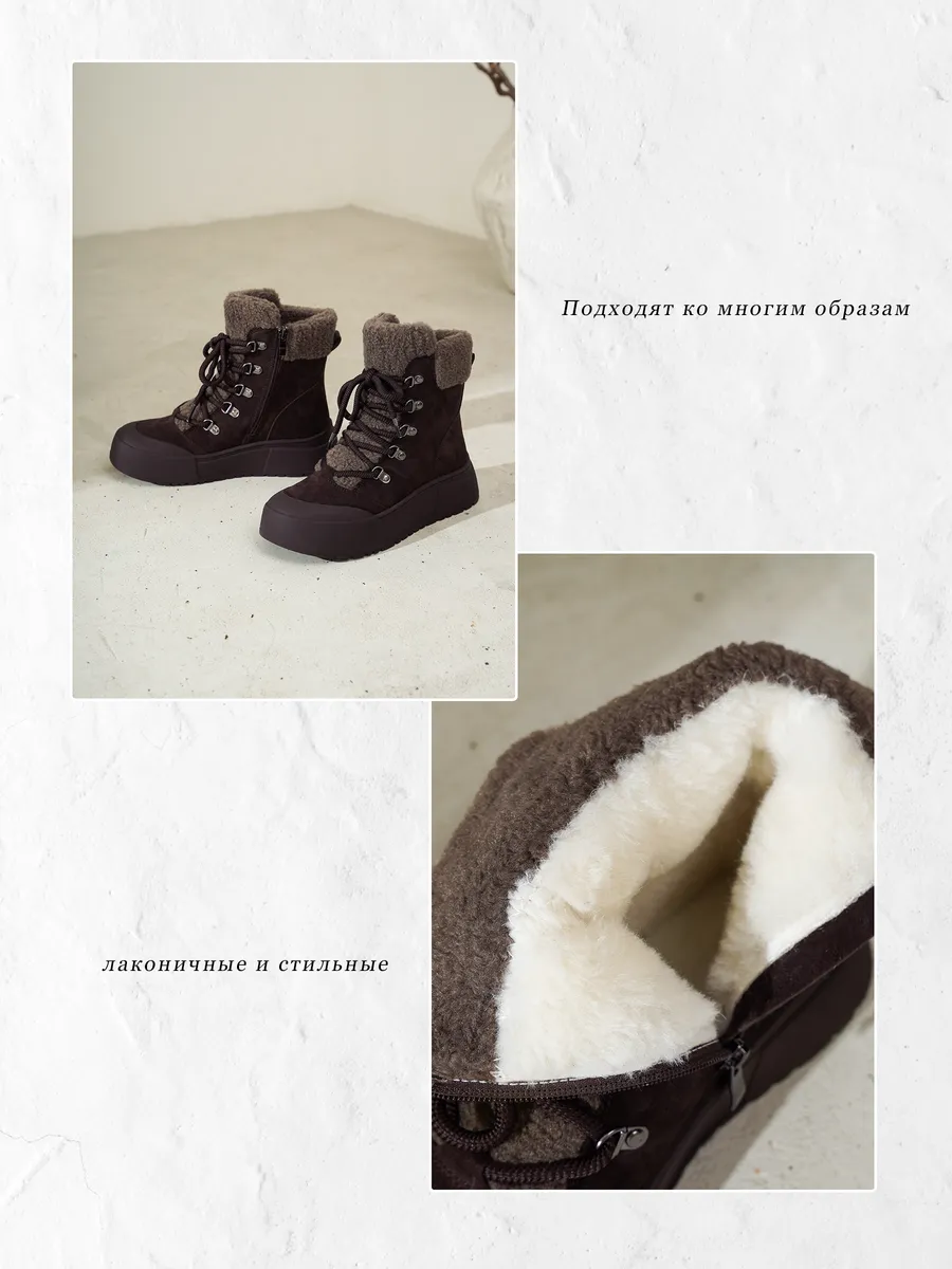 Верх выполнен из замши, приятной на ощупь и визуально подчёркивающей премиальный характер обуви. Мягкая и прочная, она адаптируется к форме ноги, создавая идеальную посадку. Внутри — плотная и тёплая шерсть, которая сохраняет тепло даже в сильный мороз и дарит ощущение домашнего комфорта.