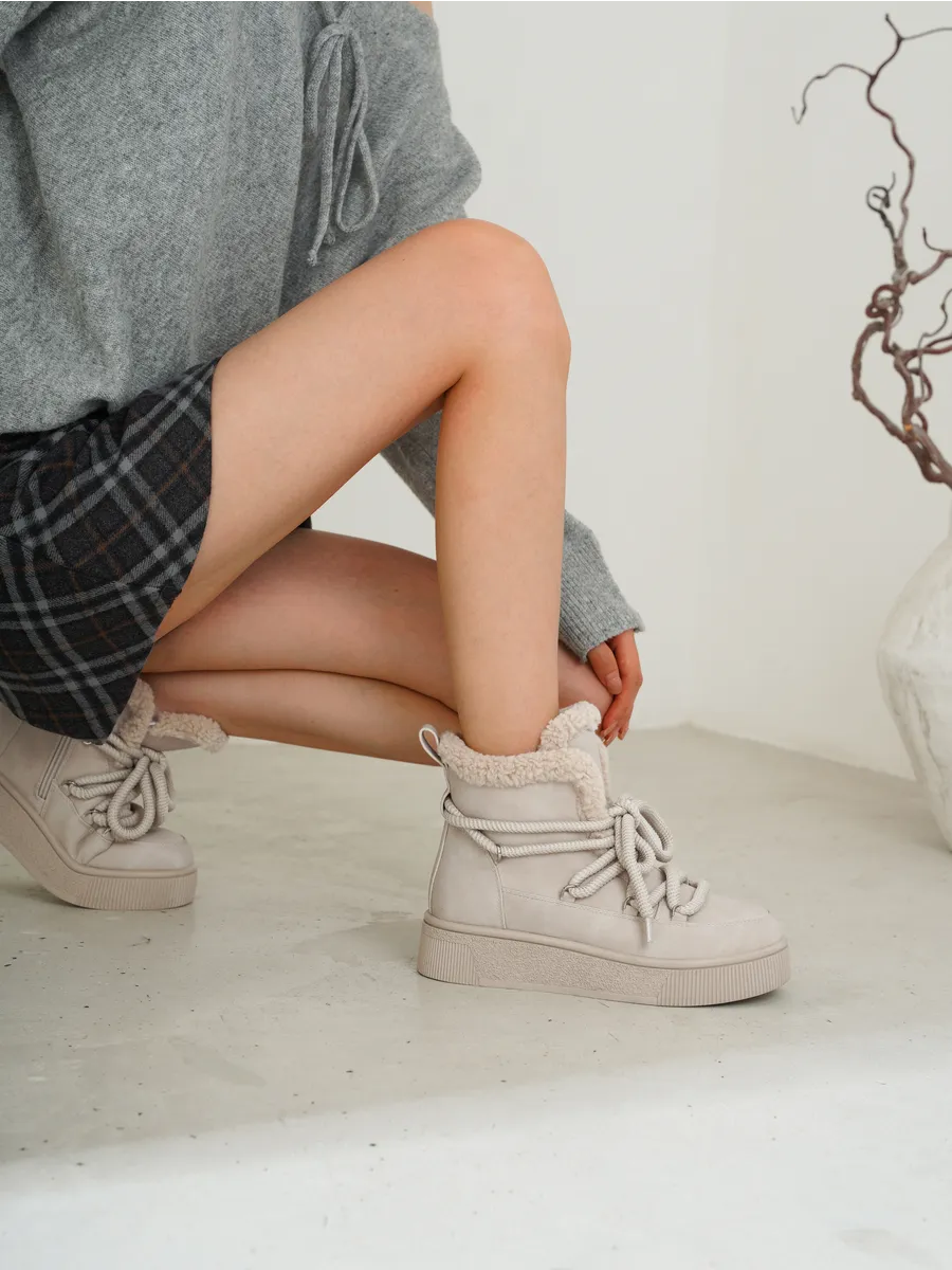 Высота голенища составляет 14 см — оптимально защищает щиколотку и ноги от ветра и снега, при этом не стесняя движений. Лёгкая платформа высотой 4,3 см добавляет устойчивость и визуально удлиняет силуэт, делая обувь подходящей для городского зимнего гардероба.